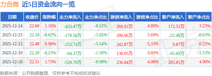 12月24日的资金流向数据方面,主力资金净流出433.47万元,占总成交额8.12%,游资资金净流入260.92万元,占总成交额4.89%,散户资金净流入172.55万元,占总成交额3.23%。