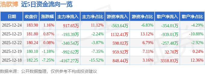 证券之星消息,截至2025年12月24日收盘,浩欧博(688656)报收于183.9元,上涨1.16%,换手率0.71%,成交量4539.0手,成交额8249.71万元。