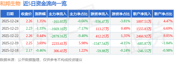 证券之星消息,截至2025年12月24日收盘,和邦生物(603077)报收于2.26元,上涨1.35%,换手率1.24%,成交量109.53万手,成交额2.46亿元。