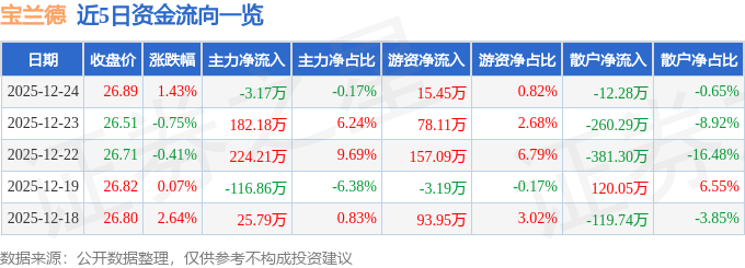 12月24日的资金流向数据方面,主力资金净流出3.17万元,占总成交额0.17%,游资资金净流入15.45万元,占总成交额0.82%,散户资金净流出12.28万元,占总成交额0.65%。