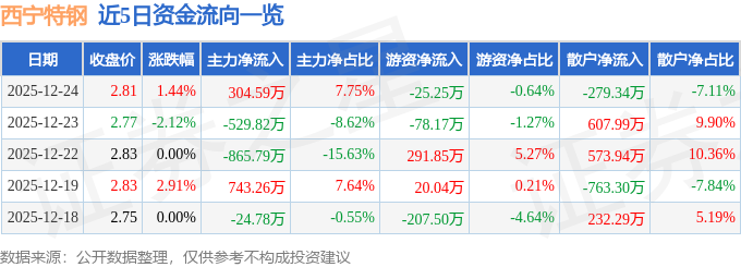 证券之星消息,截至2025年12月24日收盘,西宁特钢(600117)报收于2.81元,上涨1.44%,换手率0.43%,成交量14.12万手,成交额3929.75万元。