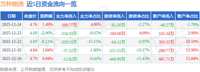 证券之星消息,截至2025年12月24日收盘,万林物流(603117)报收于4.76元,上涨1.49%,换手率0.95%,成交量5.69万手,成交额2705.39万元。