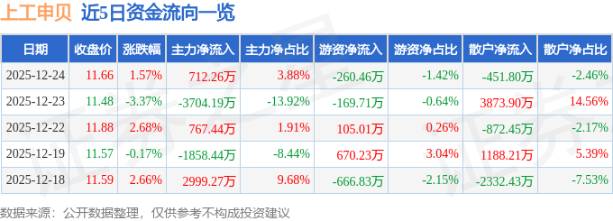 证券之星消息,截至2025年12月24日收盘,上工申贝(600843)报收于11.66元,上涨1.57%,换手率3.37%,成交量15.83万手,成交额1.84亿元。