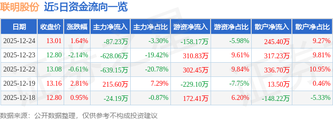 证券之星消息,截至2025年12月24日收盘,联明股份(603006)报收于13.01元,上涨1.64%,换手率0.8%,成交量2.04万手,成交额2647.14万元。