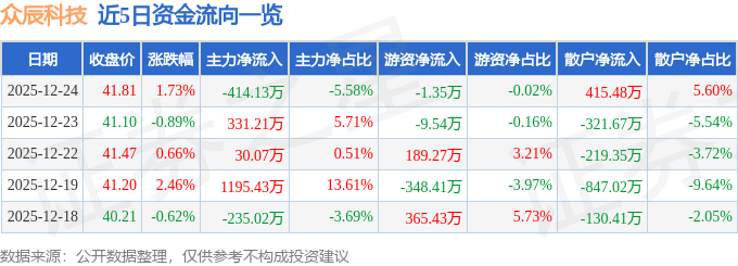 证券之星消息,截至2025年12月24日收盘,众辰科技(603275)报收于41.81元,上涨1.73%,换手率4.28%,成交量1.78万手,成交额7421.93万元。