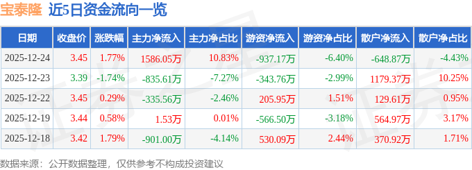 证券之星消息,截至2025年12月24日收盘,宝泰隆(601011)报收于3.45元,上涨1.77%,换手率2.24%,成交量42.83万手,成交额1.46亿元。