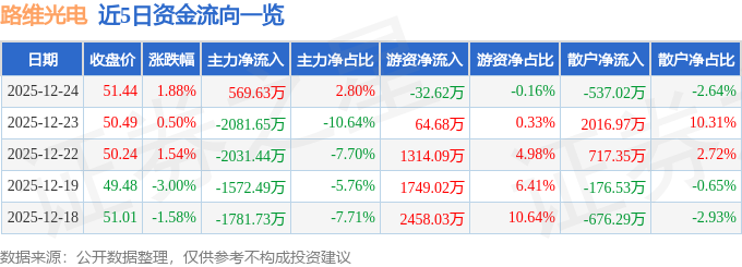 证券之星消息,截至2025年12月24日收盘,路维光电(688401)报收于51.44元,上涨1.88%,换手率2.06%,成交量3.98万手,成交额2.03亿元。