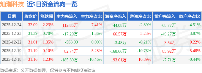 证券之星消息,截至2025年12月24日收盘,灿瑞科技(688061)报收于32.09元,上涨2.23%,换手率1.06%,成交量4773.0手,成交额1523.86万元。
