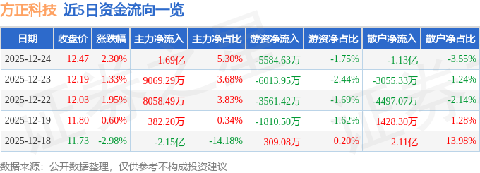 证券之星消息,截至2025年12月24日收盘,方正科技(600601)报收于12.47元,上涨2.3%,换手率6.16%,成交量256.73万手,成交额31.89亿元。
