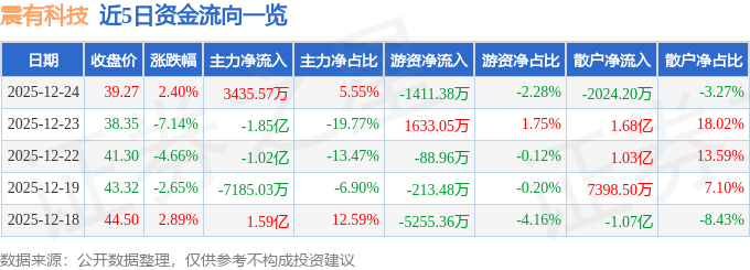 证券之星消息,截至2025年12月24日收盘,震有科技(688418)报收于39.27元,上涨2.4%,换手率8.27%,成交量15.93万手,成交额6.19亿元。