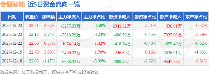 证券之星消息,截至2025年12月24日收盘,合锻智能(603011)报收于22.71元,上涨2.67%,换手率8.25%,成交量40.79万手,成交额9.16亿元。