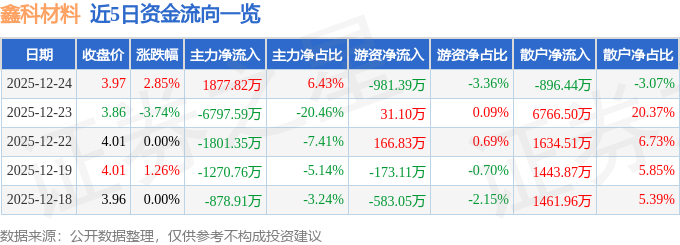 证券之星消息,截至2025年12月24日收盘,鑫科材料(600255)报收于3.97元,上涨2.85%,换手率4.1%,成交量73.97万手,成交额2.92亿元。