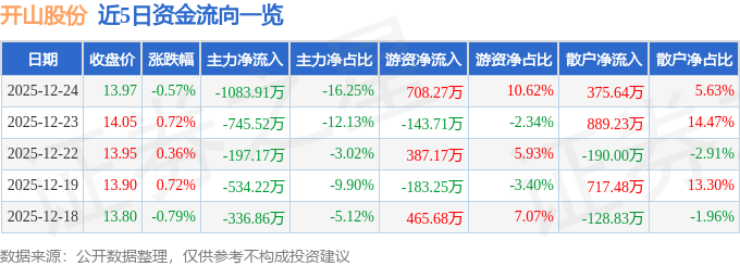 证券之星消息,截至2025年12月24日收盘,开山股份(300257)报收于13.97元,下跌0.57%,换手率0.5%,成交量4.76万手,成交额6671.22万元。