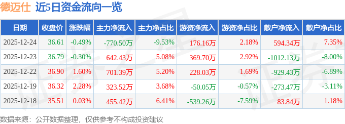 证券之星消息,截至2025年12月24日收盘,德迈仕(301007)报收于36.61元,下跌0.49%,换手率1.44%,成交量2.2万手,成交额8087.25万元。