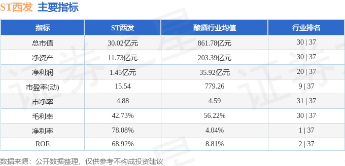 该股主要指标及行业内排名如下: