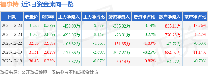 证券之星消息,截至2025年12月24日收盘,福事特(301446)报收于31.53元,下跌0.32%,换手率4.7%,成交量1.49万手,成交额4702.28万元。