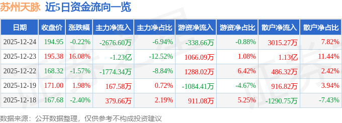 证券之星消息,截至2025年12月24日收盘,苏州天脉(301626)报收于194.95元,下跌0.22%,换手率3.77%,成交量1.99万手,成交额3.85亿元。