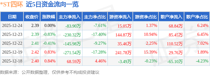 证券之星消息,截至2025年12月24日收盘,*ST四环(000518)报收于2.39元,上涨0.0%,换手率0.45%,成交量4.62万手,成交额1102.68万元。