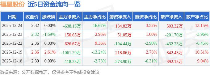 证券之星消息,截至2025年12月24日收盘,福星股份(000926)报收于2.32元,上涨0.0%,换手率1.05%,成交量16.51万手,成交额3828.33万元。