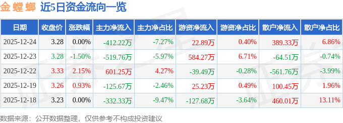 12月24日的资金流向数据方面,主力资金净流出412.22万元,占总成交额7.27%,游资资金净流入22.89万元,占总成交额0.4%,散户资金净流入389.33万元,占总成交额6.86%。
