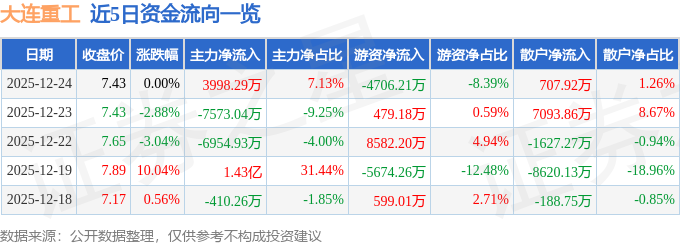 证券之星消息,截至2025年12月24日收盘,大连重工(002204)报收于7.43元,上涨0.0%,换手率3.92%,成交量75.78万手,成交额5.61亿元。