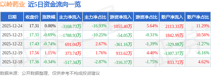 证券之星消息,截至2025年12月24日收盘,以岭药业(002603)报收于17.31元,上涨0.0%,换手率0.79%,成交量10.82万手,成交额1.87亿元。