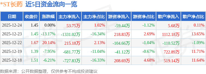 证券之星消息,截至2025年12月24日收盘,*ST长药(300391)报收于1.45元,上涨0.0%,换手率10.77%,成交量37.72万手,成交额5295.17万元。
