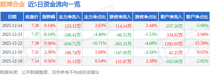 证券之星消息,截至2025年12月24日收盘,顺博合金(002996)报收于7.38元,上涨0.14%,换手率1.53%,成交量6.35万手,成交额4685.59万元。