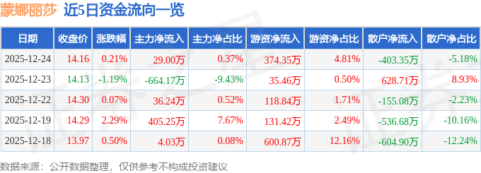 证券之星消息,截至2025年12月24日收盘,蒙娜丽莎(002918)报收于14.16元,上涨0.21%,换手率2.56%,成交量5.45万手,成交额7789.21万元。