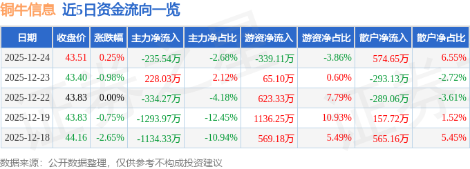 证券之星消息,截至2025年12月24日收盘,铜牛信息(300895)报收于43.51元,上涨0.25%,换手率1.46%,成交量2.02万手,成交额8776.12万元。