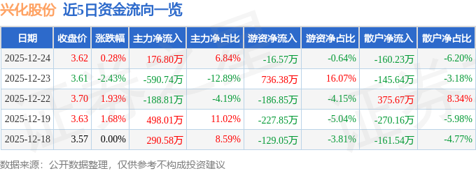 证券之星消息,截至2025年12月24日收盘,兴化股份(002109)报收于3.62元,上涨0.28%,换手率0.56%,成交量7.19万手,成交额2584.81万元。