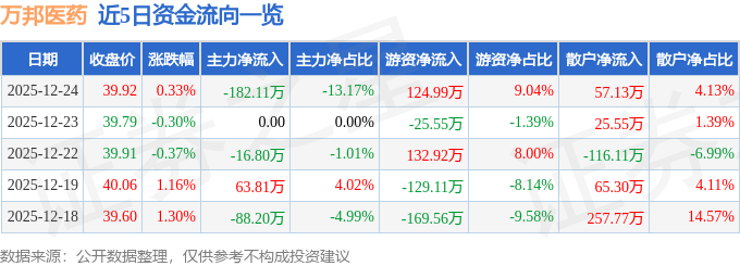 证券之星消息,截至2025年12月24日收盘,万邦医药(301520)报收于39.92元,上涨0.33%,换手率1.55%,成交量3473.0手,成交额1383.11万元。