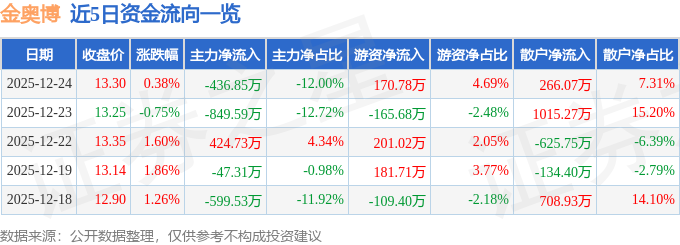 证券之星消息,截至2025年12月24日收盘,金奥博(002917)报收于13.3元,上涨0.38%,换手率1.05%,成交量2.74万手,成交额3641.58万元。