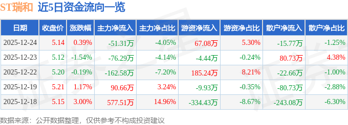 证券之星消息,截至2025年12月24日收盘,ST瑞和(002620)报收于5.14元,上涨0.39%,换手率0.78%,成交量2.47万手,成交额1265.72万元。