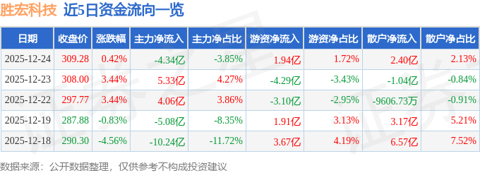 证券之星消息,截至2025年12月24日收盘,胜宏科技(300476)报收于309.28元,上涨0.42%,换手率4.28%,成交量36.64万手,成交额112.72亿元。