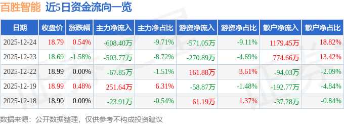 证券之星消息,截至2025年12月24日收盘,百胜智能(301083)报收于18.79元,上涨0.54%,换手率3.88%,成交量3.32万手,成交额6265.42万元。