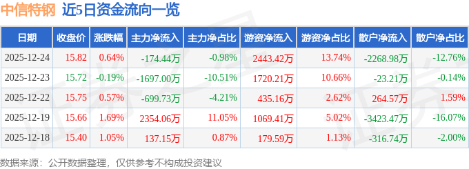 证券之星消息,截至2025年12月24日收盘,中信特钢(000708)报收于15.82元,上涨0.64%,换手率0.22%,成交量11.34万手,成交额1.78亿元。