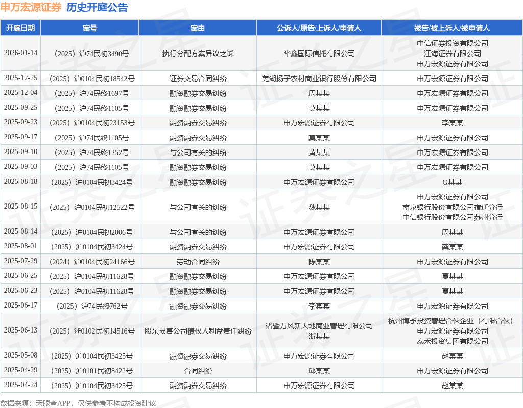 案号:(2025)沪0104民初18542号根据统计,近一年内以申万宏源证券有限公司为当事人的历史开庭公告有27则,其中案由为“融资融券交易纠纷”的公告以13则居首,其次为“与公司有关的纠纷”有5则,“执行分配方案异议之诉”有2则。历史开庭公告(前20条)如下: