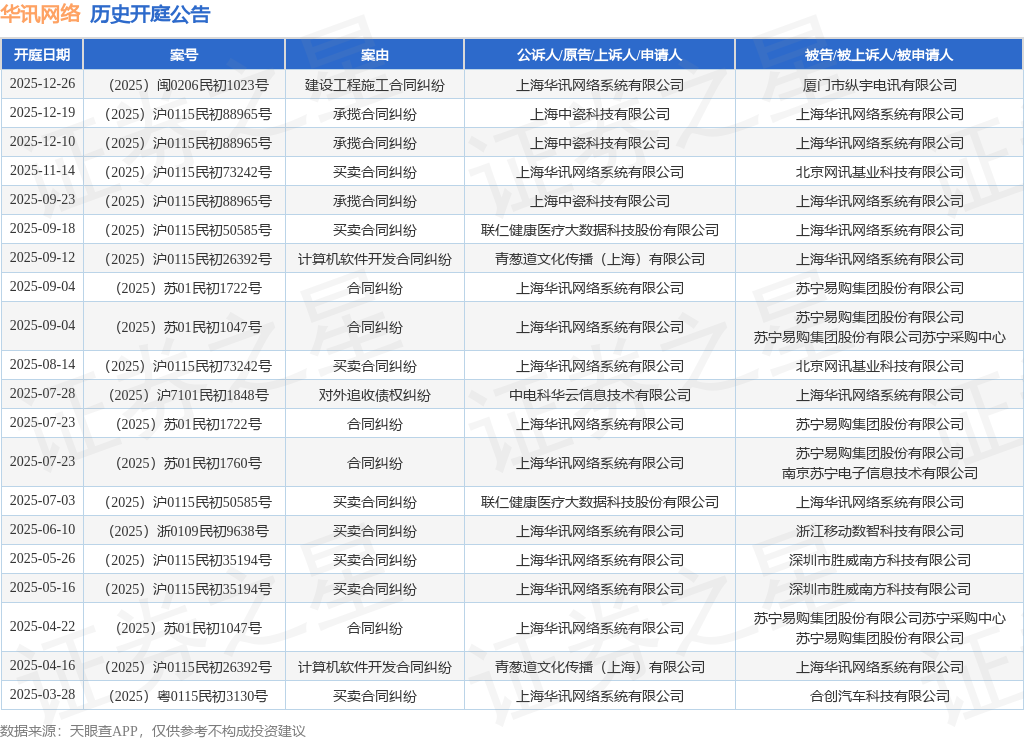 案号:(2025)闽0206民初1023号根据统计,近一年内以上海华讯网络系统有限公司为当事人的历史开庭公告有25则,其中案由为“买卖合同纠纷”的公告以11则居首,其次为“合同纠纷”有7则,“承揽合同纠纷”有3则。历史开庭公告(前20条)如下: