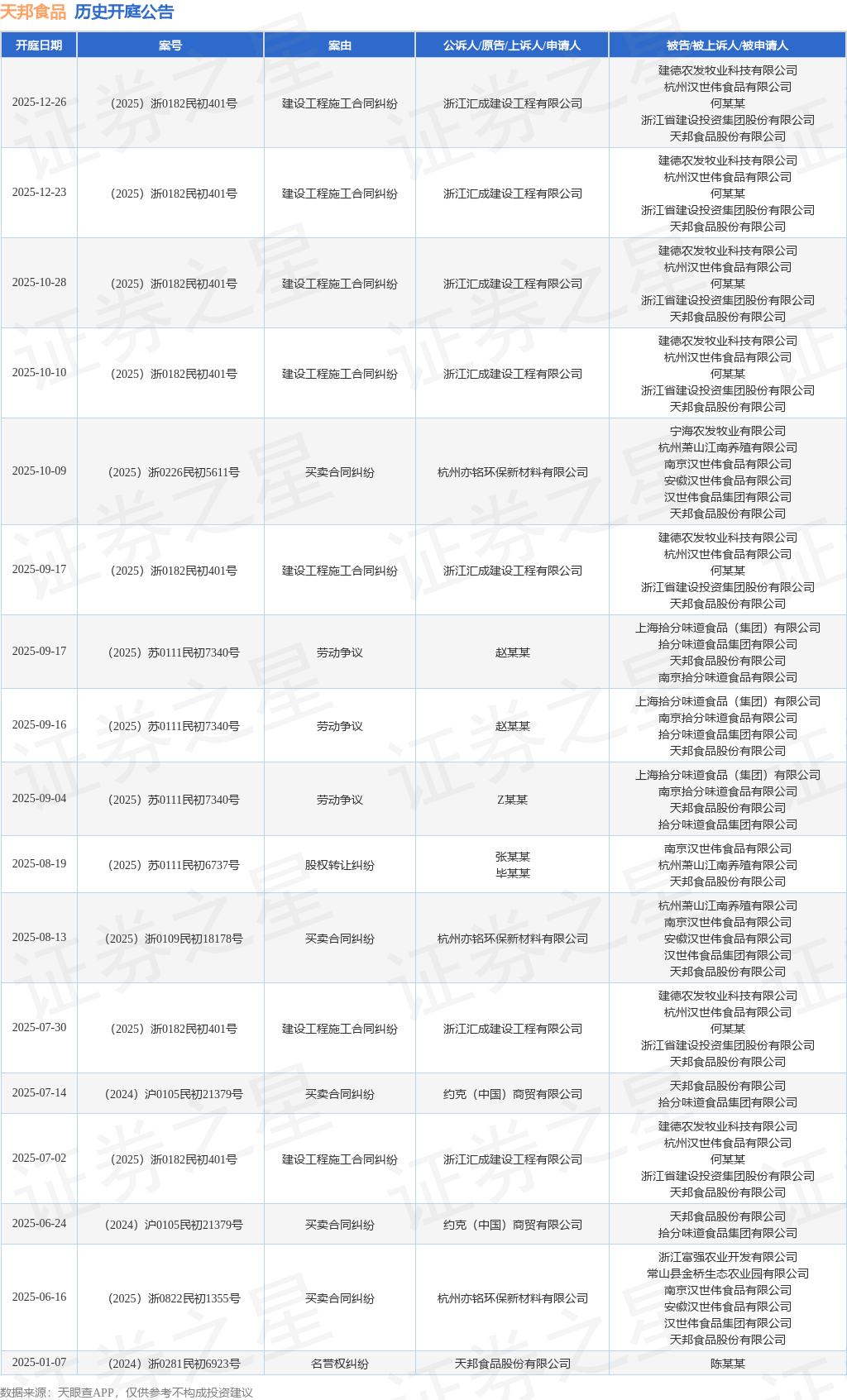 根据统计,近一年内以天邦食品股份有限公司为当事人的历史开庭公告有17则,其中案由为“建设工程施工合同纠纷”的公告以7则居首,其次为“买卖合同纠纷”有5则,“劳动争议”有3则。历史开庭公告如下: