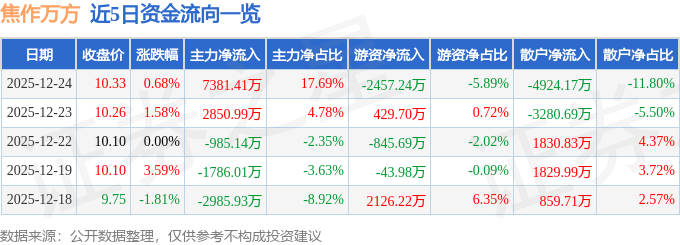 证券之星消息,截至2025年12月24日收盘,焦作万方(000612)报收于10.33元,上涨0.68%,换手率3.41%,成交量40.59万手,成交额4.17亿元。