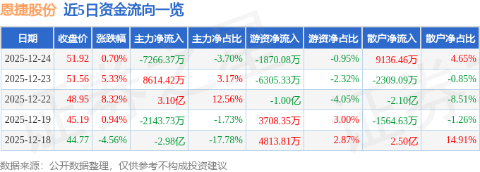 证券之星消息,截至2025年12月24日收盘,恩捷股份(002812)报收于51.92元,上涨0.7%,换手率4.62%,成交量38.02万手,成交额19.66亿元。