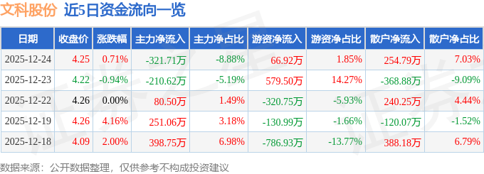 证券之星消息,截至2025年12月24日收盘,文科股份(002775)报收于4.25元,上涨0.71%,换手率1.81%,成交量8.54万手,成交额3621.72万元。