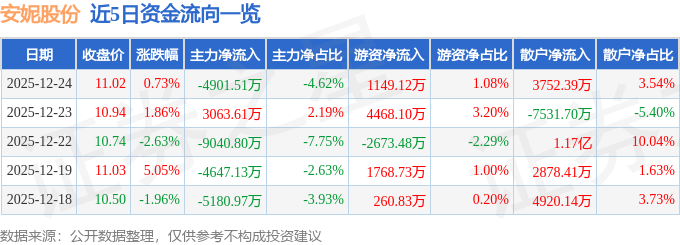 证券之星消息,截至2025年12月24日收盘,安妮股份(002235)报收于11.02元,上涨0.73%,换手率17.52%,成交量97.0万手,成交额10.61亿元。