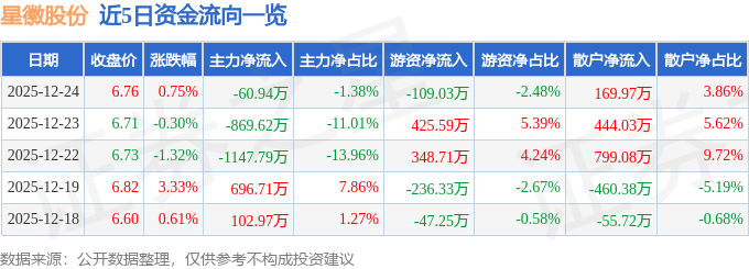 证券之星消息,截至2025年12月24日收盘,星徽股份(300464)报收于6.76元,上涨0.75%,换手率1.84%,成交量6.54万手,成交额4400.65万元。