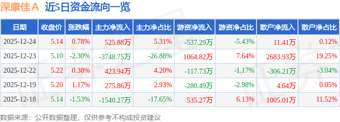12月24日的资金流向数据方面,主力资金净流入525.88万元,占总成交额5.31%,游资资金净流出537.29万元,占总成交额5.43%,散户资金净流入11.41万元,占总成交额0.12%。