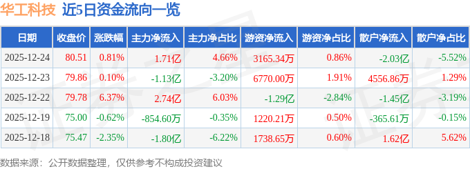 证券之星消息,截至2025年12月24日收盘,华工科技(000988)报收于80.51元,上涨0.81%,换手率4.56%,成交量45.86万手,成交额36.72亿元。