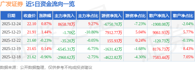 证券之星消息,截至2025年12月24日收盘,广发证券(000776)报收于22.1元,上涨0.87%,换手率0.72%,成交量42.56万手,成交额9.34亿元。