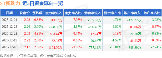 证券之星消息,截至2025年12月24日收盘,ST新动力(300152)报收于2.28元,上涨0.88%,换手率2.43%,成交量17.3万手,成交额3945.82万元。