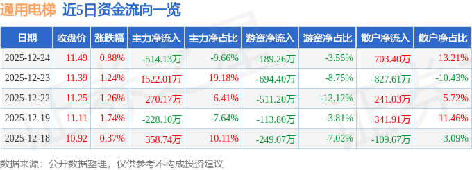 证券之星消息,截至2025年12月24日收盘,通用电梯(300931)报收于11.49元,上涨0.88%,换手率2.52%,成交量4.67万手,成交额5323.86万元。